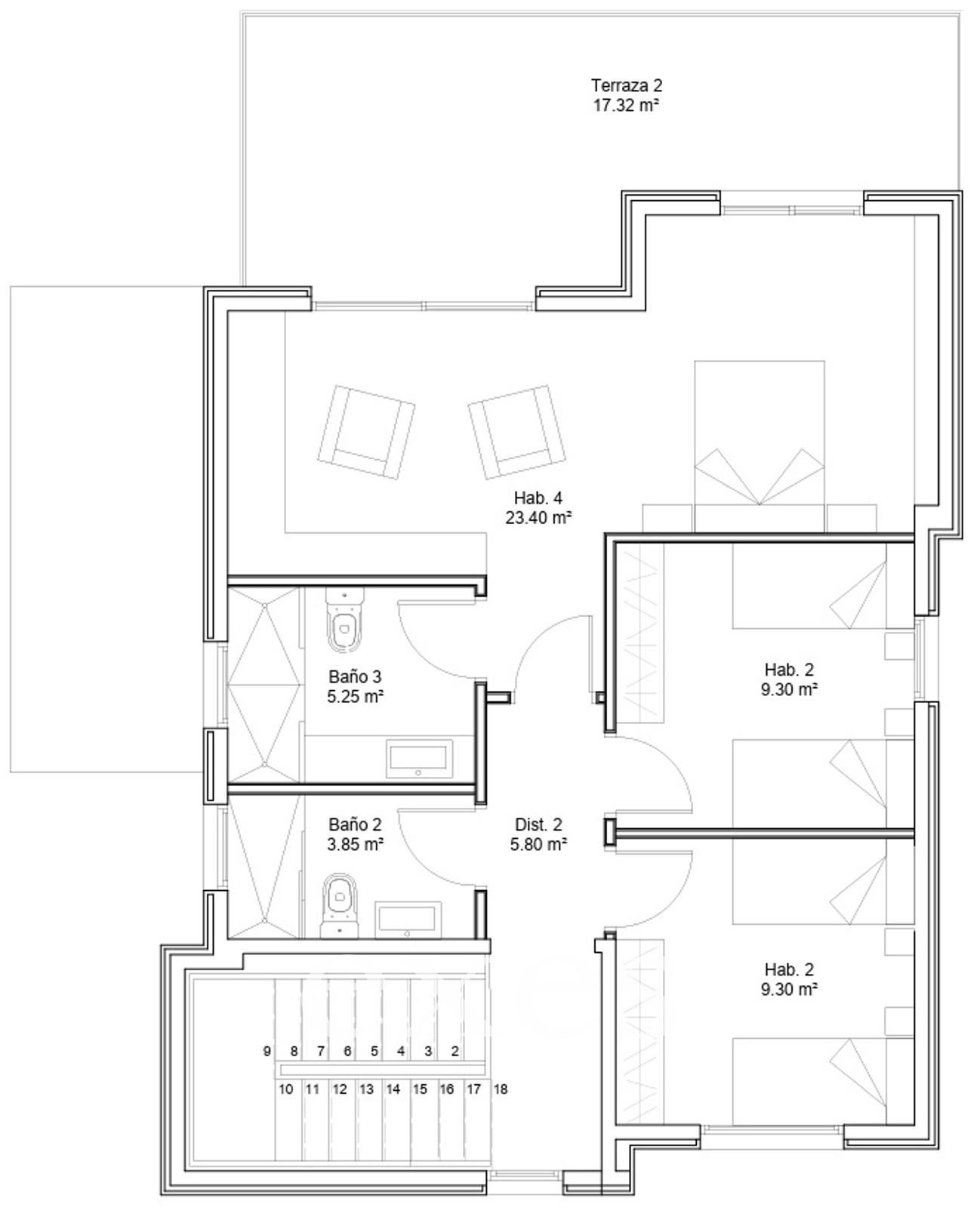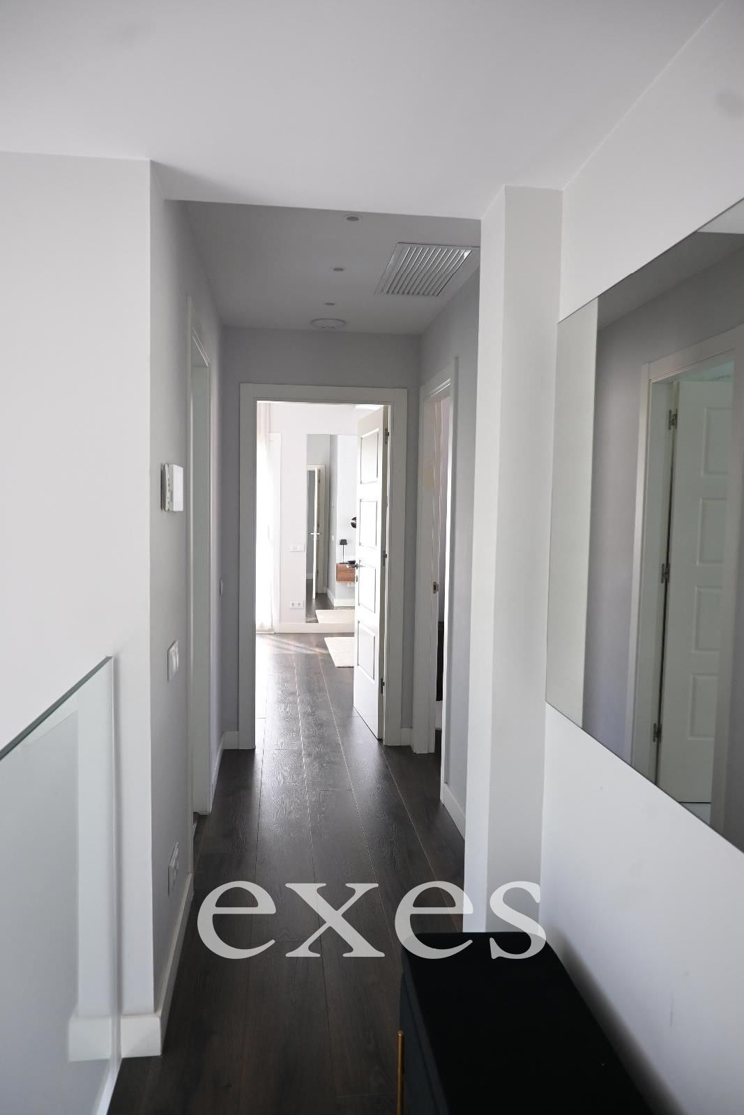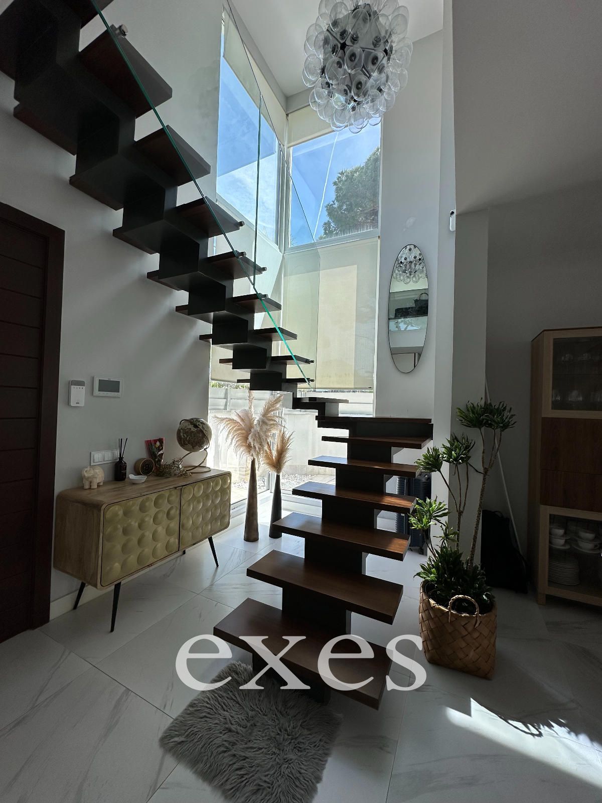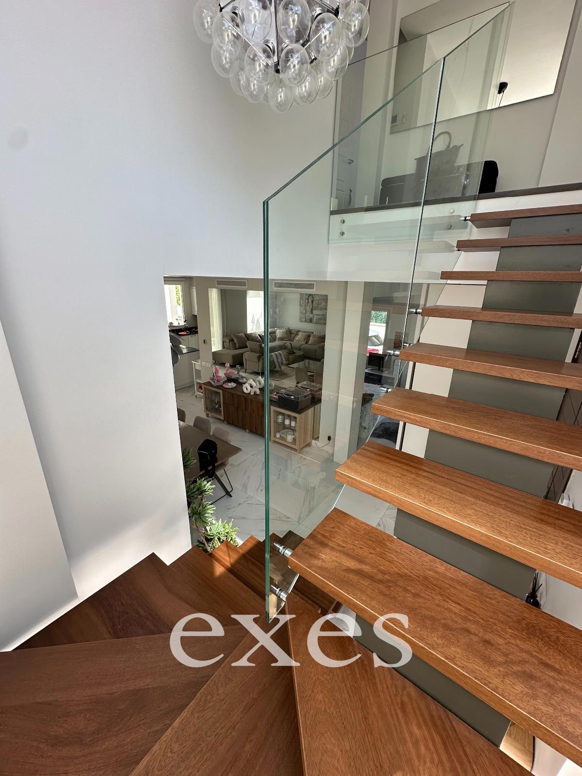 Como elemento arquitectónico distintivo, la propiedad incorpora una espectacular escalera suspendida, con estructura ligera y acabados en madera de iroco —una madera tropical de extraordinaria resistencia y belleza— que aporta carácter, calidez y singularidad al conjunto.